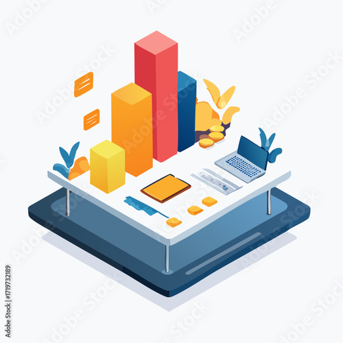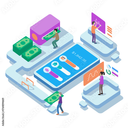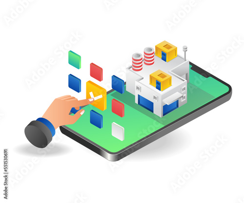 Mobile banking. Isometric bank building, gold bar on smartphone screen, vector illustration. Mobile service and online financial transactions. Gold deposit, bank investments.