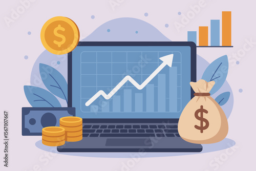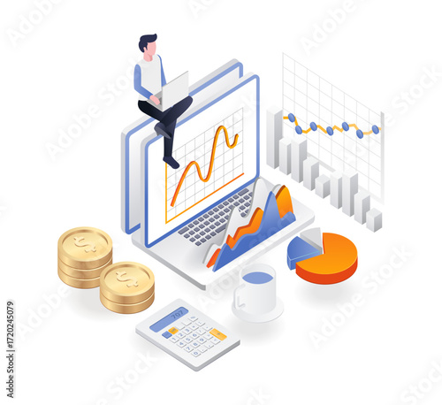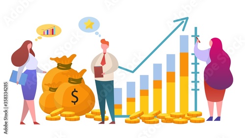 Financial investments. Isometric bank cards with people putting dollar coins into piggy box, flat vector illustration. Raising arrow bar chart. Money saving, economy.