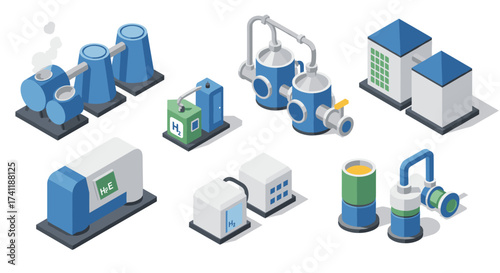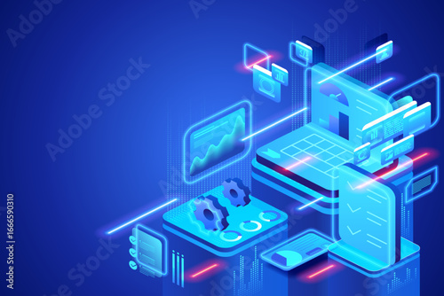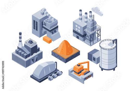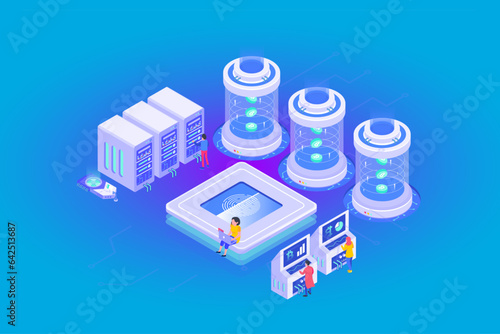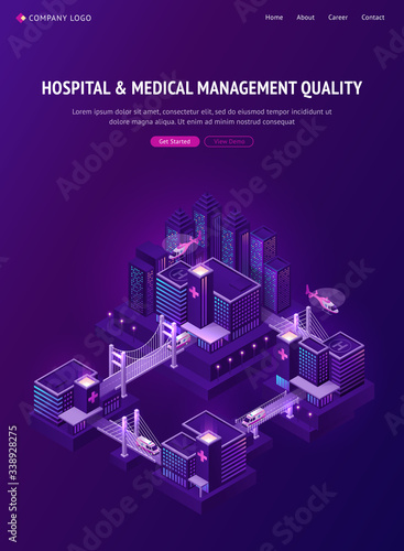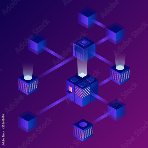 Isometric city building set, vector isolated illustration. Urban modern architecture, purple neon lighting.