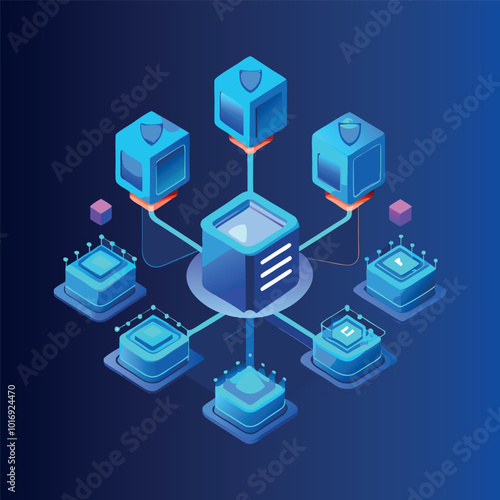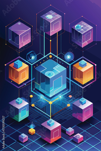 Isometric city building set, vector isolated illustration. Urban modern architecture, purple neon lighting.