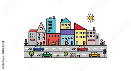 Isometric city streets, residential and commercial buildings, public transport, flat vector illustration. City architecture, urban landscape design.