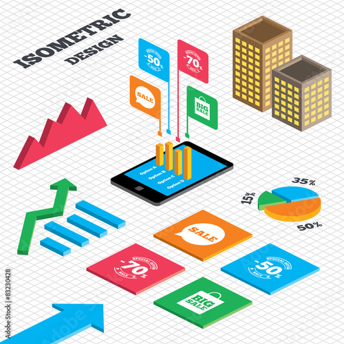 Isometric smartphone with residential house building on screen, flat vector illustration. Real estate for buying or rent via the internet. Rent home online concept.