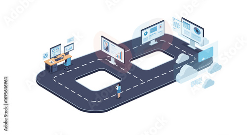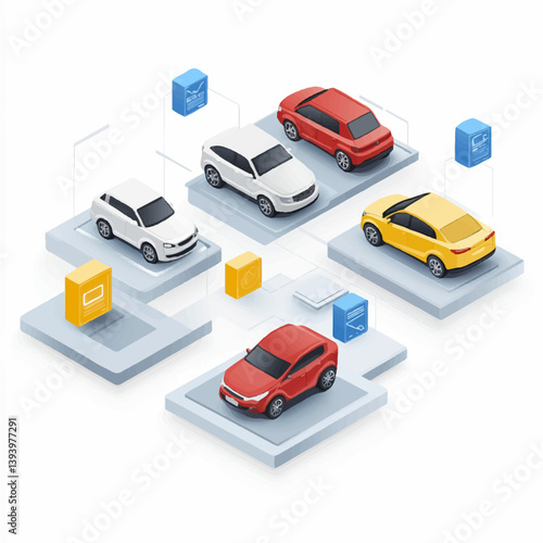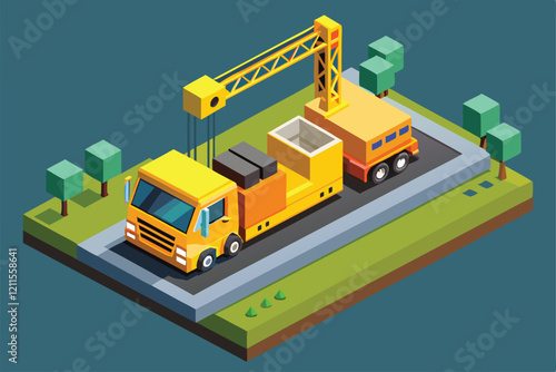 Smartphone with yellow car on tow truck evacuator on screen, flat vector isometric illustration. Roadside assistance, car towing online service.