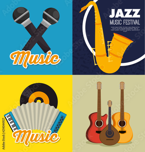 Jazz festival, live music concert poster, flyer, card template set. Vector flat illustration of musical instruments, music notes and accessories.