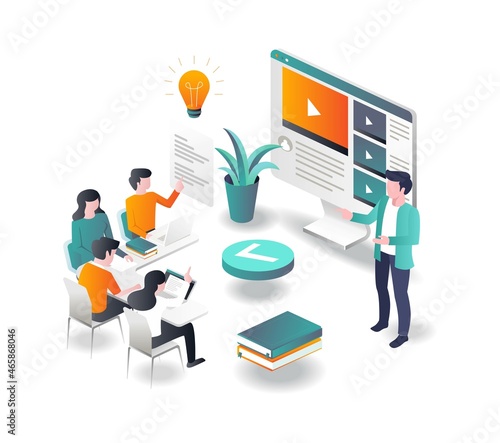 Job search concept vector flat isometric illustration. Woman sitting at desk with computer and vacancy sign next to jobs promotional stand and people searching for job.