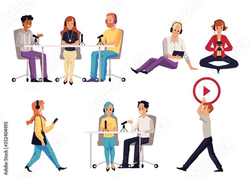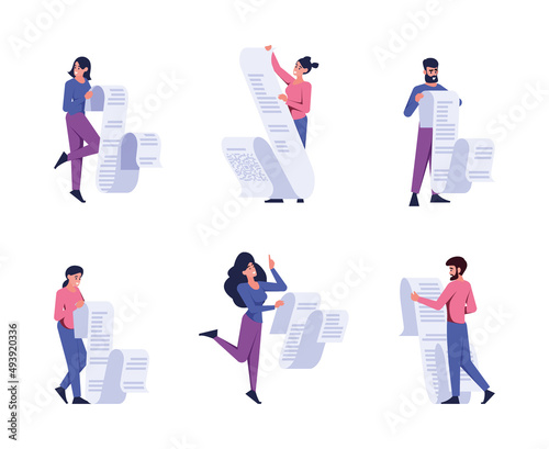 Job search male and female cartoon character set, vector isolated illustration. Job candidates with newspaper, cv, laptop, mobile phone looking for work. Employment, recruitment, career.
