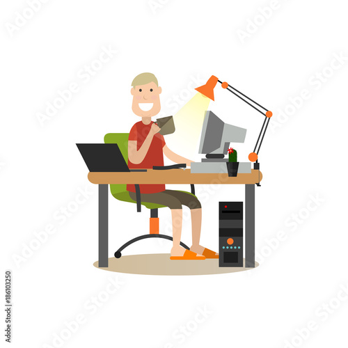 Vector illustration of office worker male using computer and drinking coffee. Coffee house people flat style design element, icon isolated on white background.