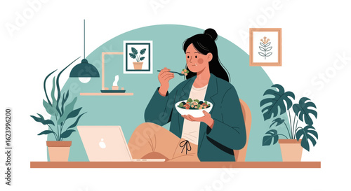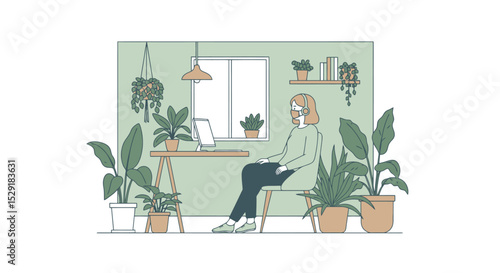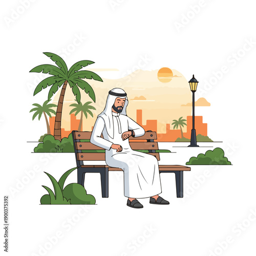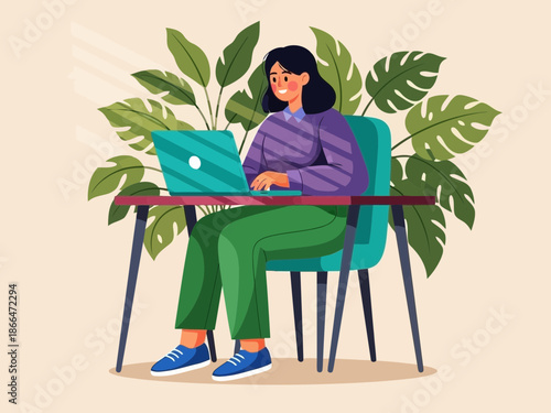 Vector illustration of office worker male using computer and drinking coffee. Job concept flat style design element.