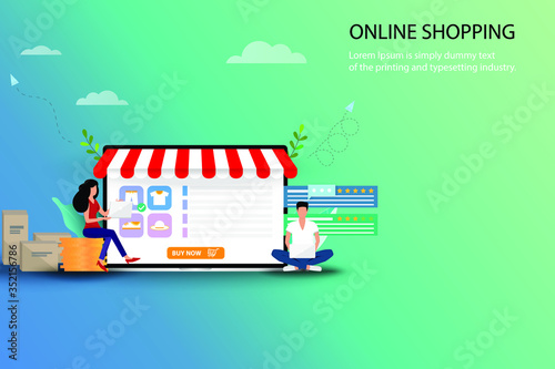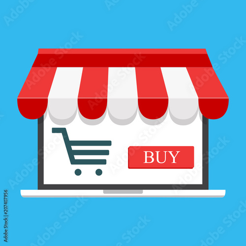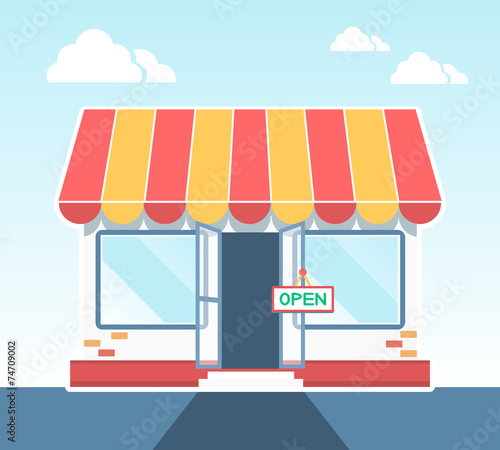 Juice store, flat vector illustration. Apple juice in display case. Salesman standing at counter. Supermarket, grocery store beverage section. Retail shop small business.