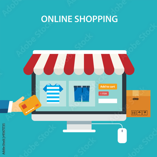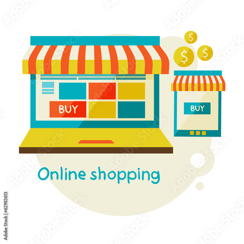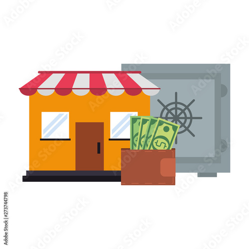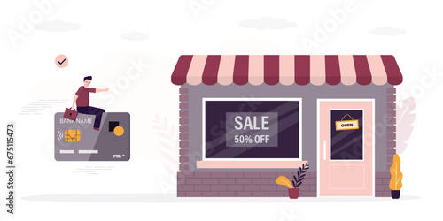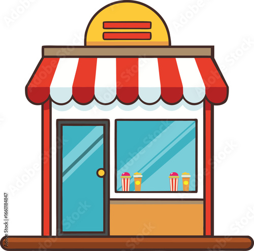 Juice store, flat vector illustration. Apple juice in display case. Salesman standing at counter. Supermarket, grocery store beverage section. Retail shop small business.