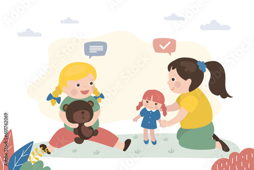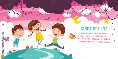 Kids painting party vector illustration with happy children drawing using paints, pencils, felt-tip pens markers, multi-colored crayons. Happy childhood entertainment