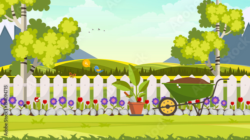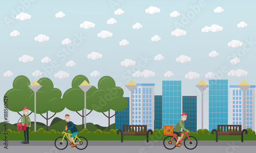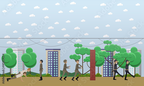 Kindergarten playground concept vector illustration. Preschool teacher looking after kids swinging, sliding down the slide, playing in the playground. Flat style design.
