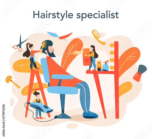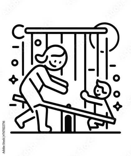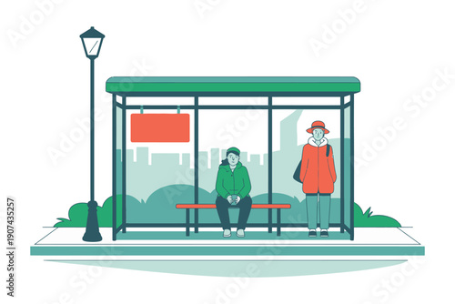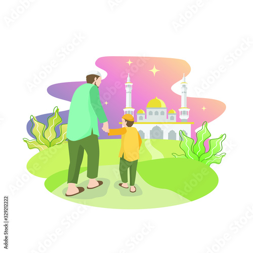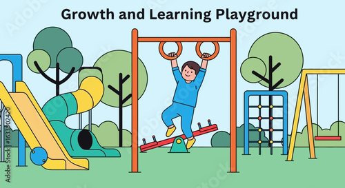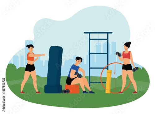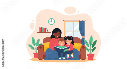 Kindergarten upbringer concept vector illustration. Preschool teacher meeting girl, attending playschool, with her mother in playground in the morning. Flat style design.