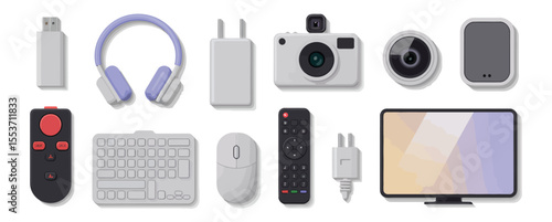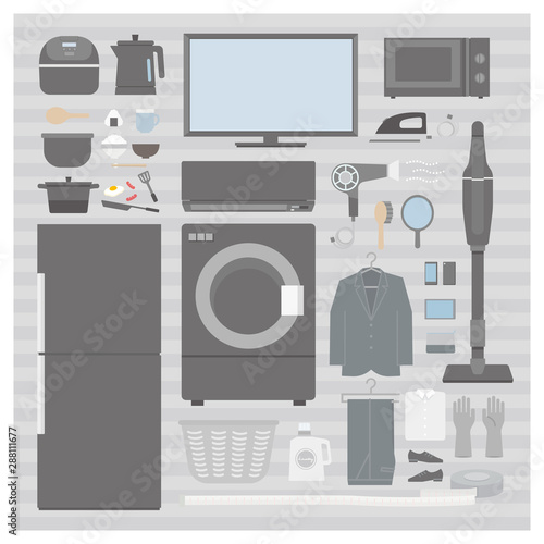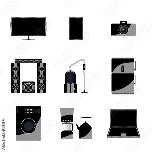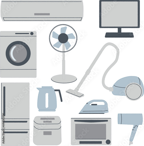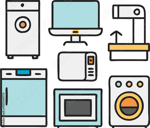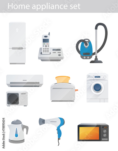 Kitchen appliances. Vector set of household electric appliances and utensils. Microwave, fridge, kettle, blender, oven.