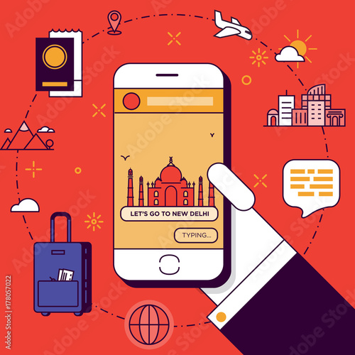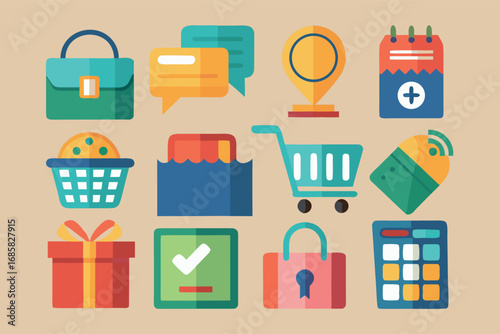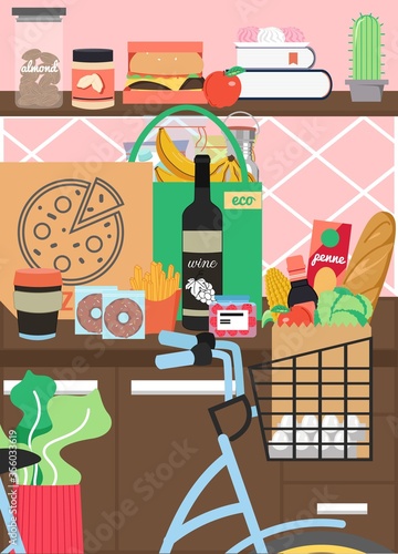 Kitchen interior with furniture and foodstuff for bike home food delivery theme poster, vector flat illustration. Kitchen room with wine pizza box, fast food on counter, delivery bike with grocery bag