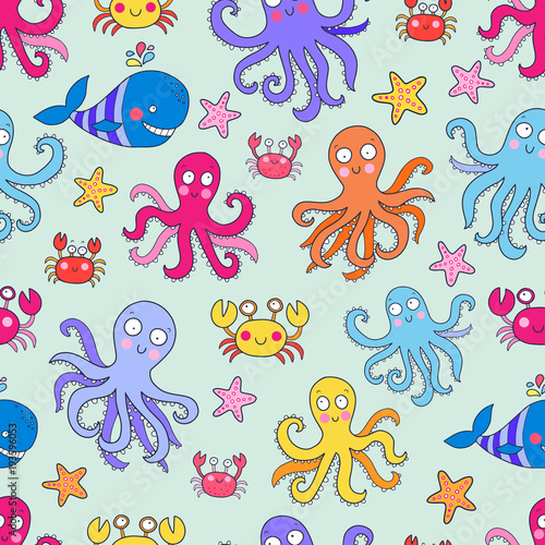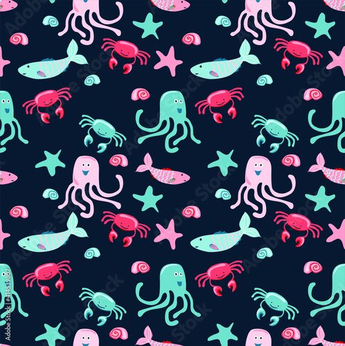 Koi fish swimming in pond with beautiful water lilies, flat vector illustration. Lake with decorative japanese carp fishes and lotus flowers, top view.
