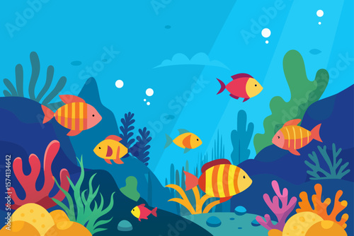 Lake top view background with swimming koi fish. Blue water pound with lily lotus flower vector illustration in cartoon style