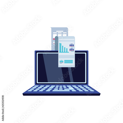 Laptop computer with backpack full of school supplies on screen, vector illustration. Online education, distance learning.