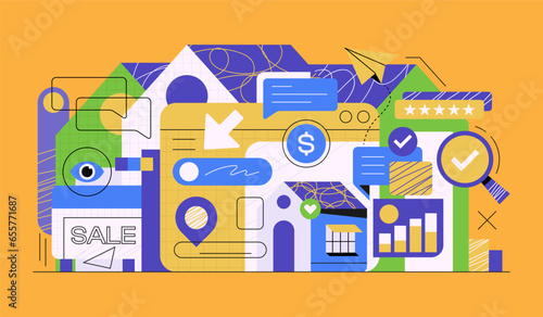 Last sale. Retail online store. Male and female characters with megaphone, price tags, gift boxes, flat vector illustration. Online deals, discounts and clearance sales.