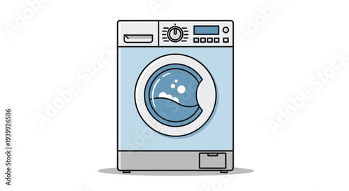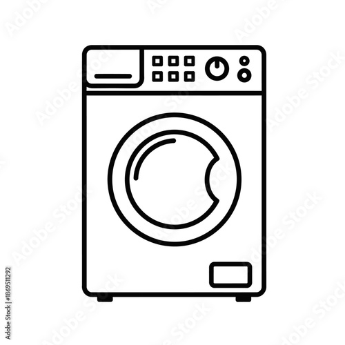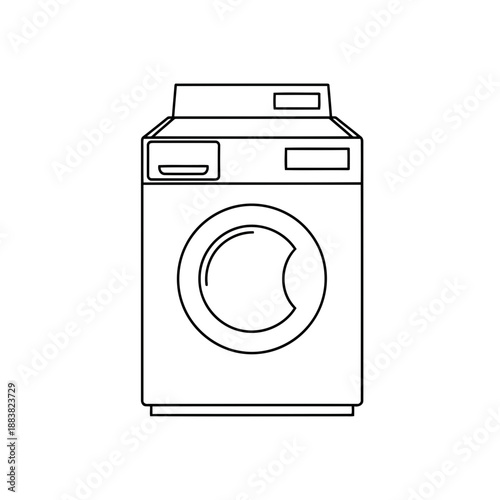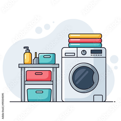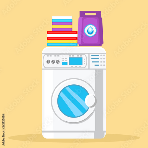 Laundry self service flat vector banner template. Linear poster with washing powder, automatic washing machine, folded neat clean linen stack illustration