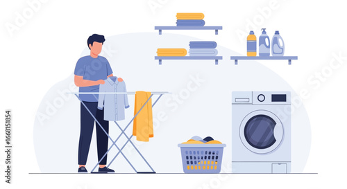 Laundry room with big washing machine and tiny characters, vector flat style design illustration. Coin laundry service concept for web banner, website page etc.