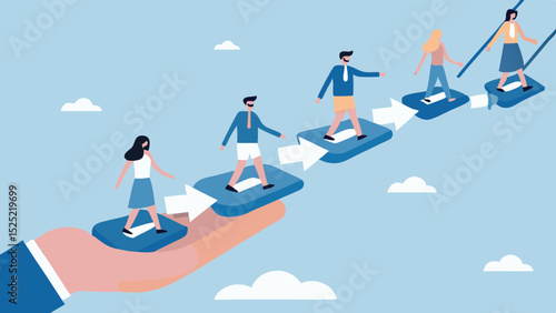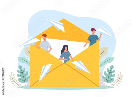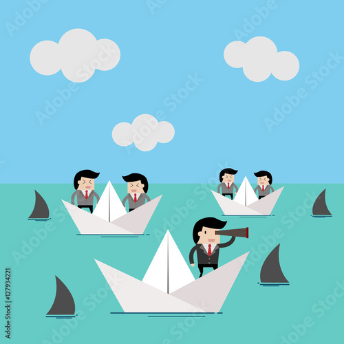 Leader and team in origami paper boat vector. Businessman boss chief looking through binocular searching way to success leading employee group. Business and leadership concept