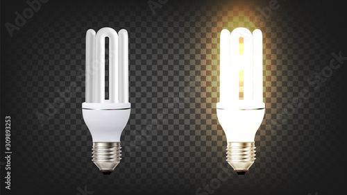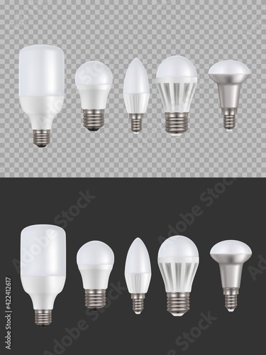 Led light bulb set, vector illustration isolated on transparent background. Floodlight and high bay fixtures, tube light, household lamps etc. Energy saving lamps.