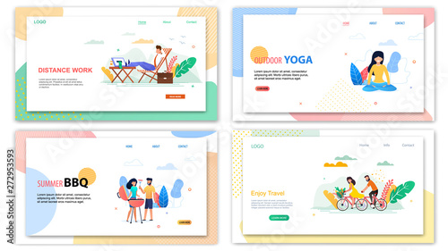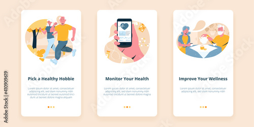 Leisure activities. Meditation, yoga, painting, healthy eating. Mobile app screens. Vector banner template for website and mobile development. Web site and UI design illustration.
