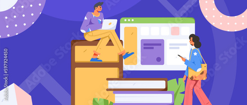 Library, bookstore with bookcase and books on shelves, male and female characters reading, choosing books, vector illustration. Education concept for web banner, website page etc.