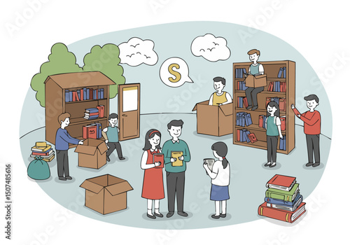 Library reception with male and female characters librarian, readers, vector illustration. Education concept for web banner, website page etc.