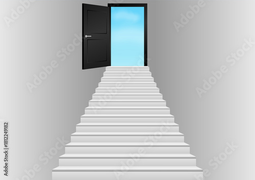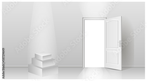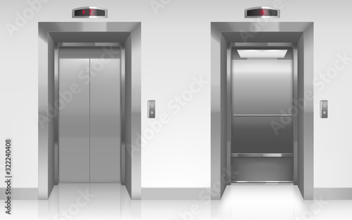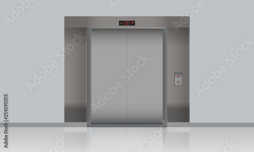 Lift door and stairs in lobby realistic vector. Elevator with closed metal gates and open door to upstairs illustration. Building hall interior design
