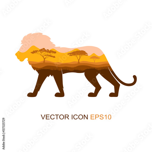 Lion animal silhouette isolated on white background. Vector illustration design in paper cut style. African lion and savannah double exposure.