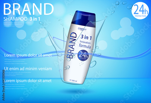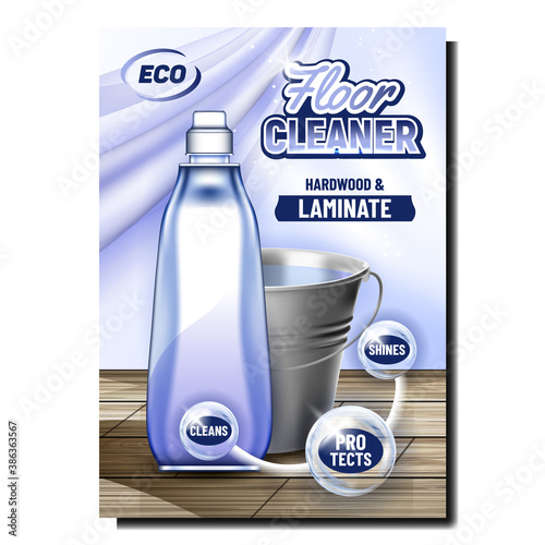 Liquid laundry detergent ad vector 3d illustration. Laundry detergent in realistic plastic bottle with label promo poster.