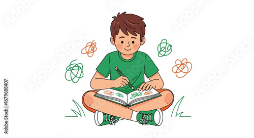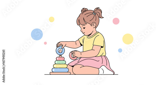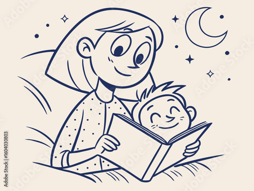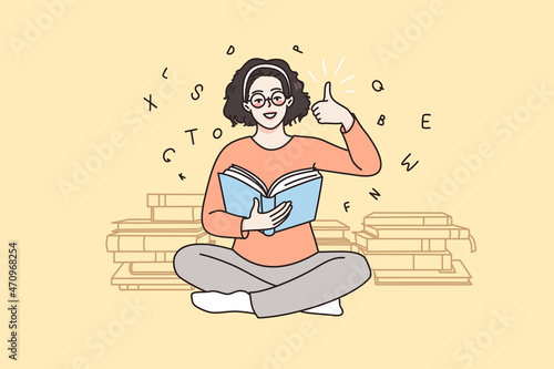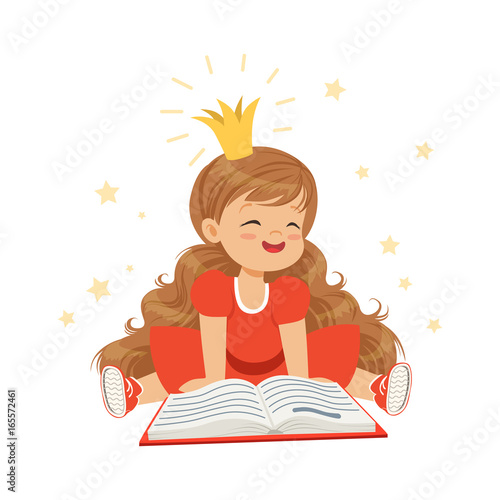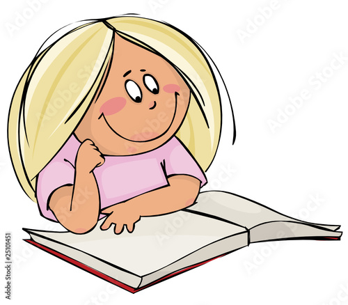 Little girl reading book on a bed. Vector illustration in comic pop art style. Girl dreaming about something reading tale.