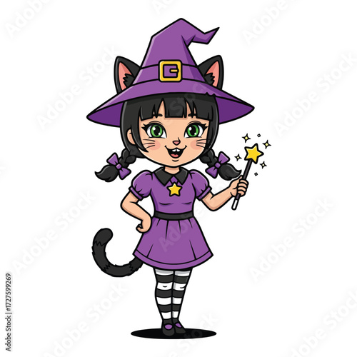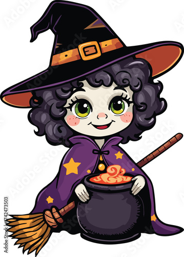 Little girl witch cartoon character wearing festive costume reading spell in magic book standing over boiling cauldron vector illustration. Halloween and witchcraft concept