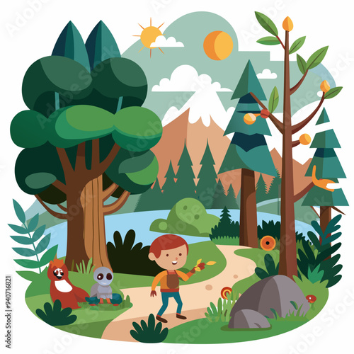 Little kids playing hide and seek game in forest vector illustration. Cartoon children summer vacation activity in mountain camp