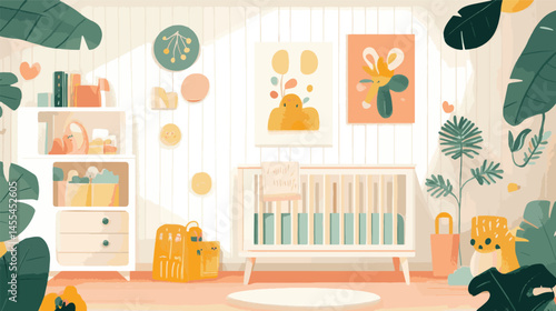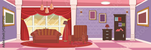 Living room interior, flat vector illustration. No people apartment, home workplace with desk, computer, sewing machine, cloth mannequin etc.