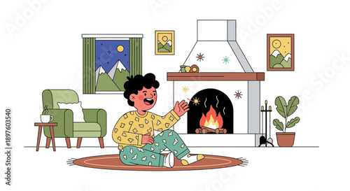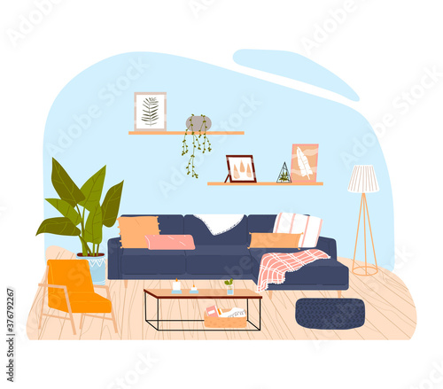 Living room interior hand drawn vector illustration. Home modern interior design. Cozy room furniture and accessories. Chair, nightstand, house plant.