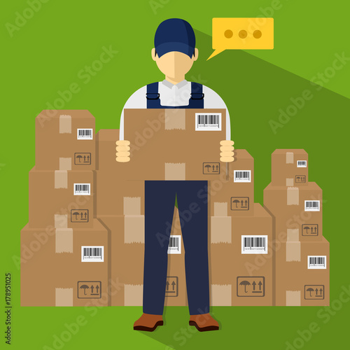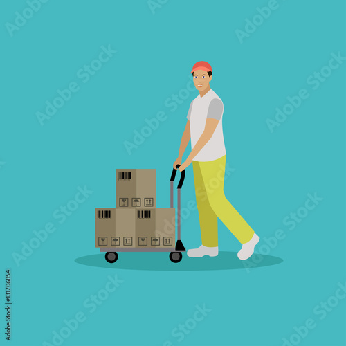 Vector illustration of worker pushing cargo cart or platform trolley with cardboard boxes. Delivery company services. Loader concept flat style design element.