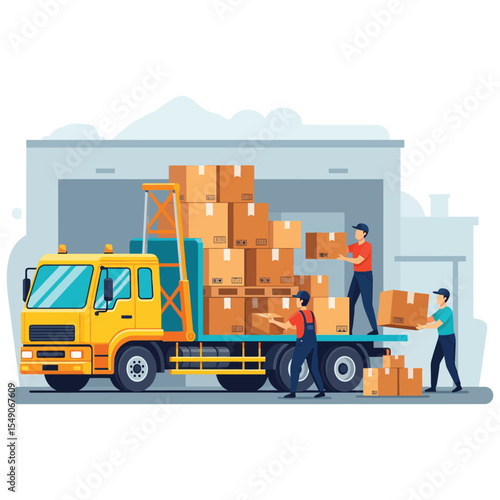 Male characters loaders loading eco hemp delivery truck with recreational cannabis, medical marijuana, CBD products, flat vector illustration. Cannabis delivery service, legal marijuana business.