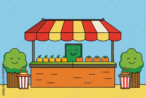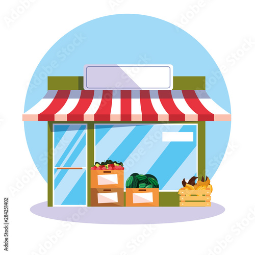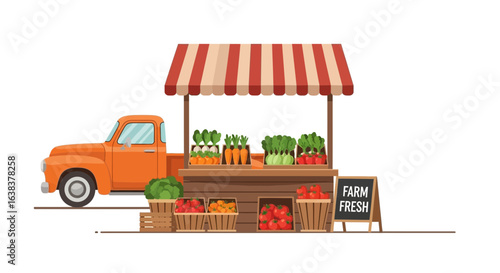 Local market food stalls, farmer shops. People buying fruits, spices, fish, meat, cheese, bread, flat vector isolated illustration. Purchase and sale of natural organic food, eco farm products.