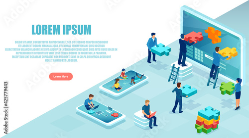 Logical games, landing page design, website banner template, flat vector isometric illustration. Kids playing domino, puzzle games. Preschool education, iq tasks.