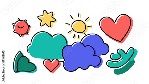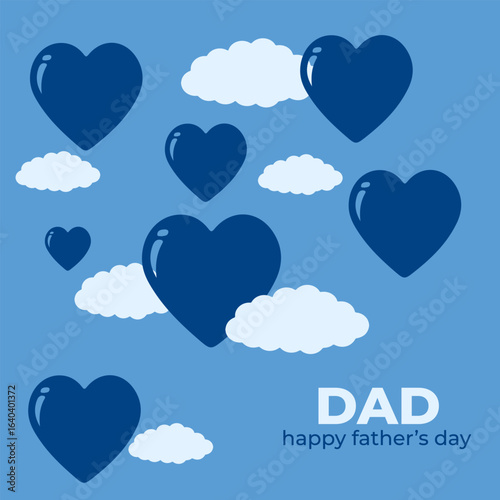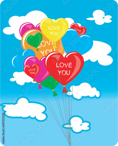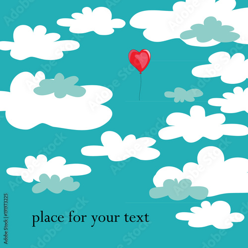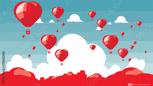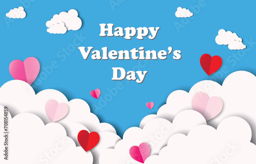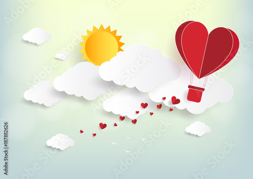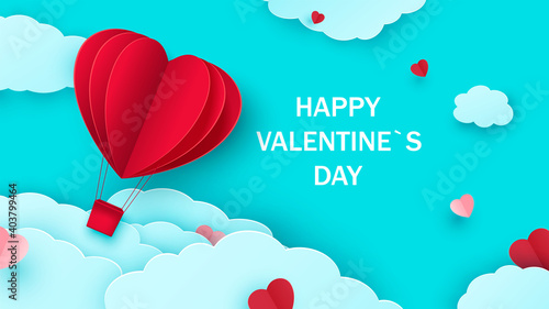 Vector layered paper cut style sky with clouds, flying heart hot air balloon, cute girl falling in love sitting on fluffy clouds. Sweet dreams about love concept. Valentines Day greeting card template
