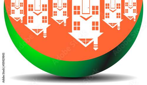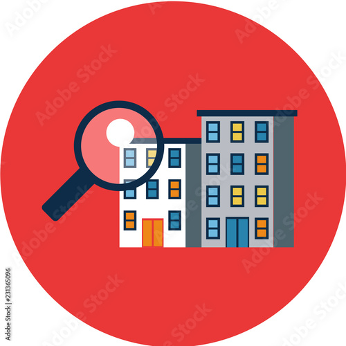 Magnifying glass with city elements inside, vector illustration in paper art style. Search for house, real estate concept.