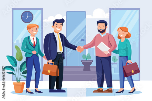 Vector illustration of postman delivering letters to receiver man. Cheerful smiling mailman with post bag and letters. Home delivery. Mailing concept design element in flat style.