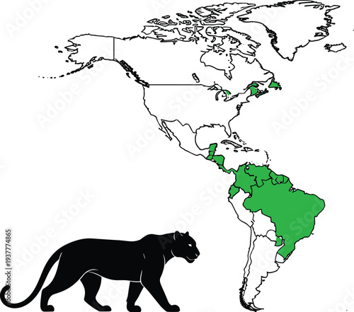 Wildlife of North America, world continent. Vector illustration in paper art style. Mainland North America map with nature, bison, moose raccoon, striped skunk, coyote jaguar wild animals silhouettes.