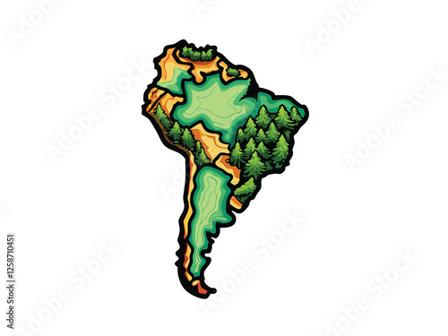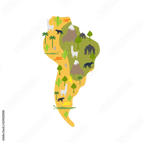 Wildlife of South America, world continent. Vector illustration in paper art style. Mainland South America map with nature and llama, tapir, jaguar, cingulata, monkey, penguin wild animals silhouettes