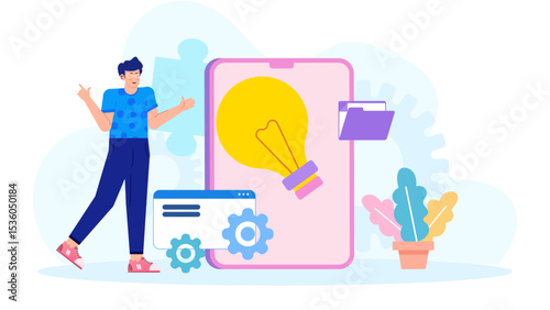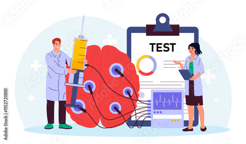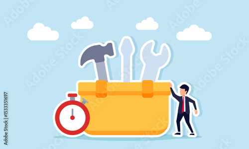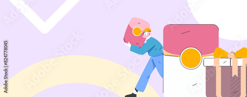 Huge cosmetic bag with beauty products blush, eyeshadow, lipstick, mascara, eyeliner and micro characters. Beauty salon, makeup studio services concept for web banner, website page etc.