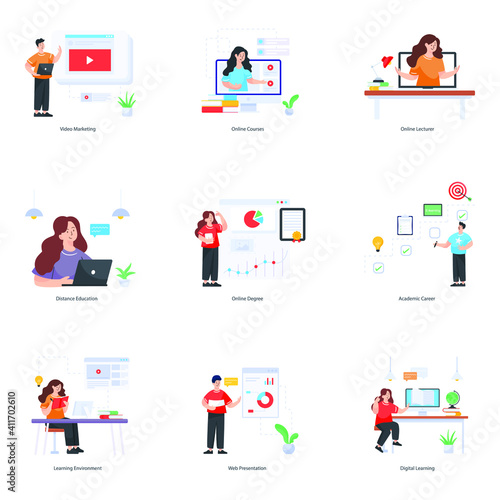 Male and female teachers stay next to blackboard in school. Vector illustration set of teachers, man and woman. Elementary school, math, geometry, chemistry, grammar.