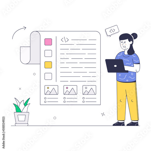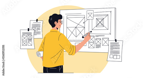 Male architect making changes to drawing building project plan vector icon isolated on white background.